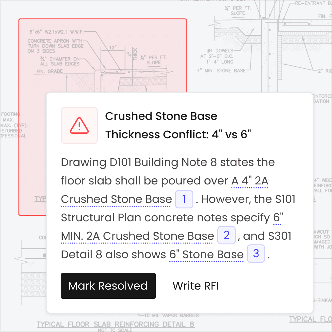 Surface risks, scope gaps, and discrepancies before they become RFIs or change orders.